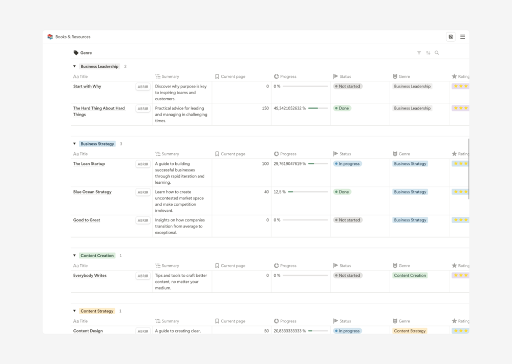 - Organized reading lists sorted by genre or category.