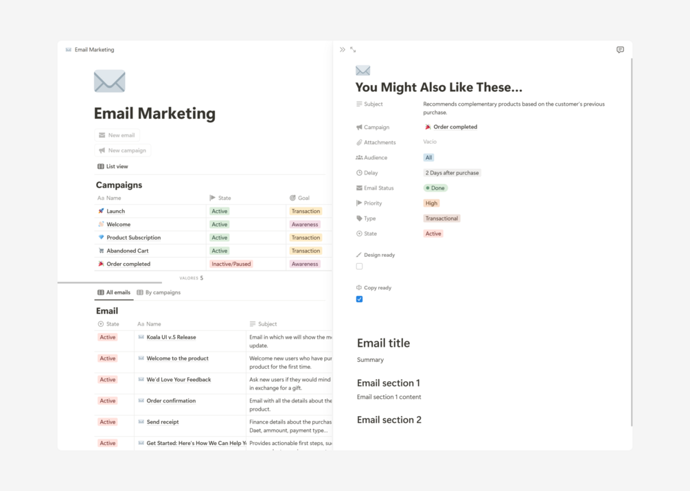 The Email Marketing template is your go-to system for managing campaigns, tracking performance, and creating effective email strategies. Designed for marketers, this template ensures your email workflows are seamless and impactful.