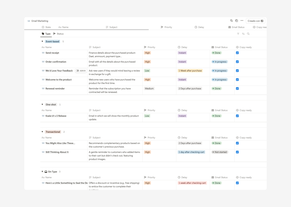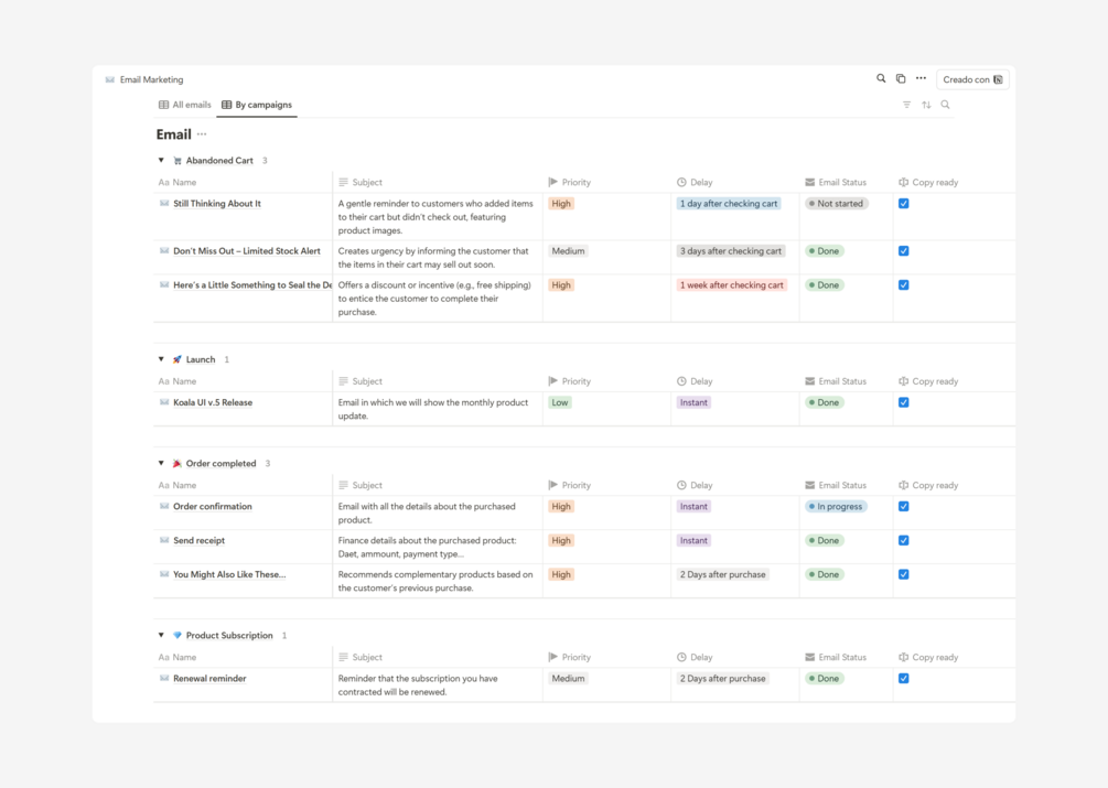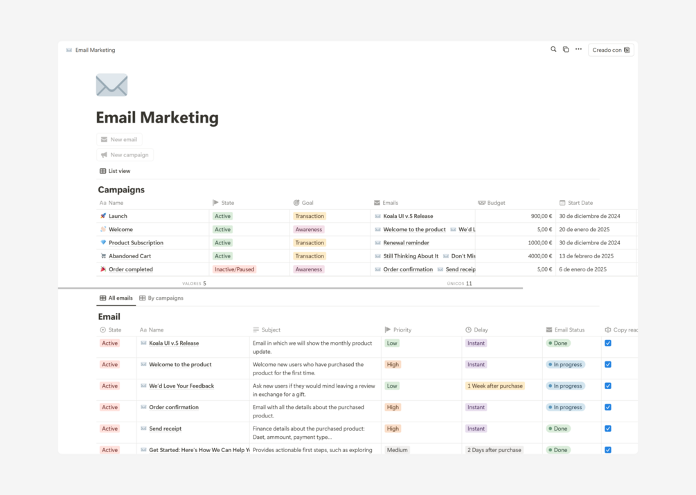 The Email Marketing template is your go-to system for managing campaigns, tracking performance, and creating effective email strategies. Designed for marketers, this template ensures your email workflows are seamless and impactful.