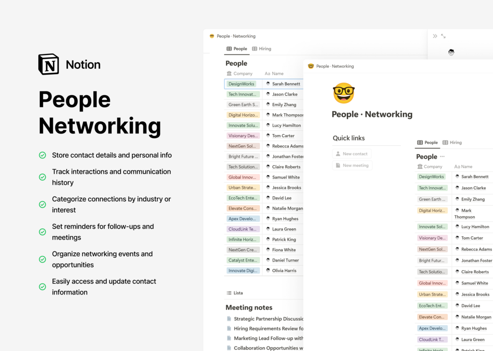 The People Networking template is a must-have for organizing and maintaining your professional and personal connections. This template helps you build meaningful relationships, keep track of important details, and ensure you’re always one step ahead in your networking efforts.